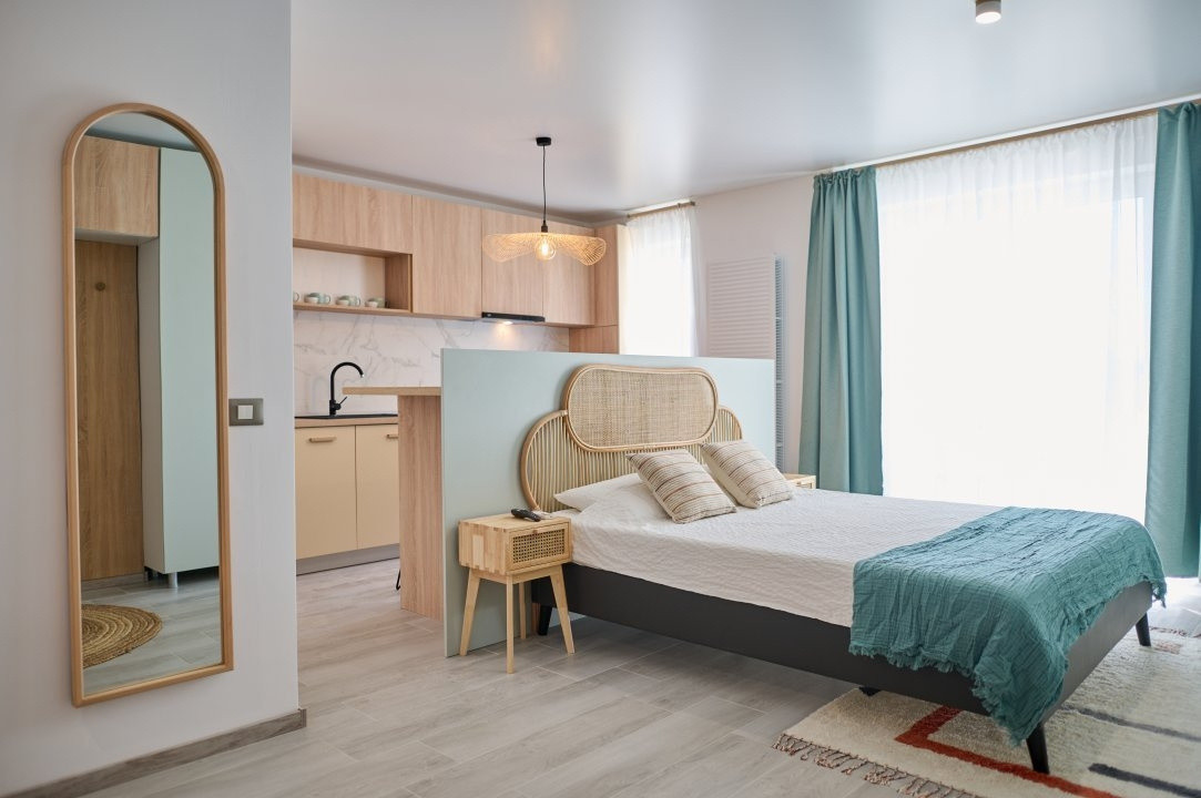 Spatiu aerisit, finisaje calde, bucatarie complet utilata, zona de dormit confortabila si terasa cocheta pentru pauze de cafea.